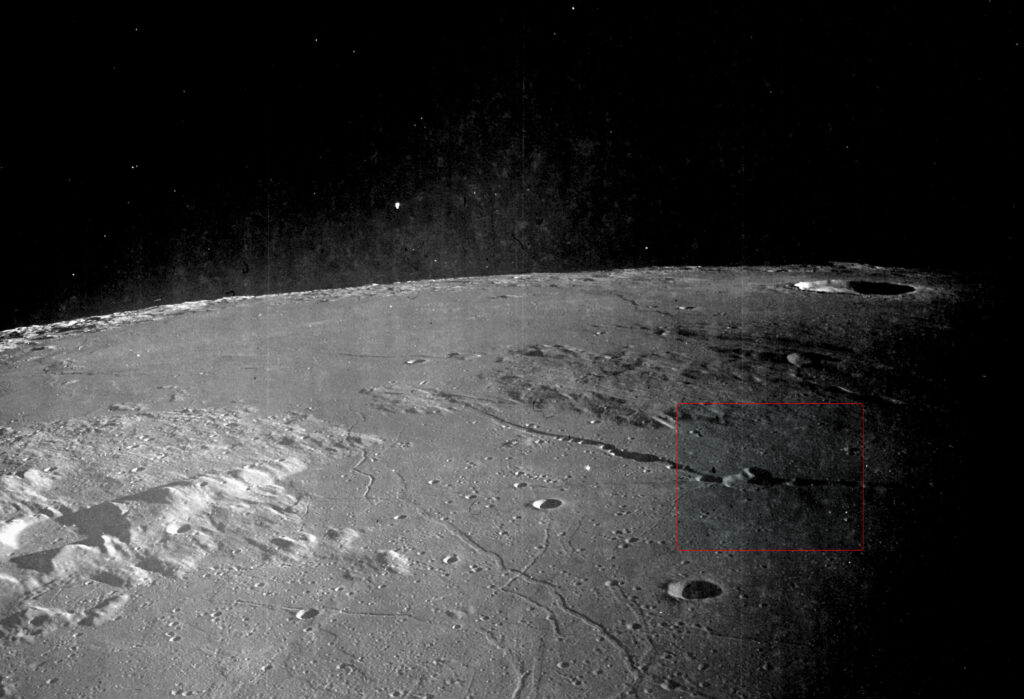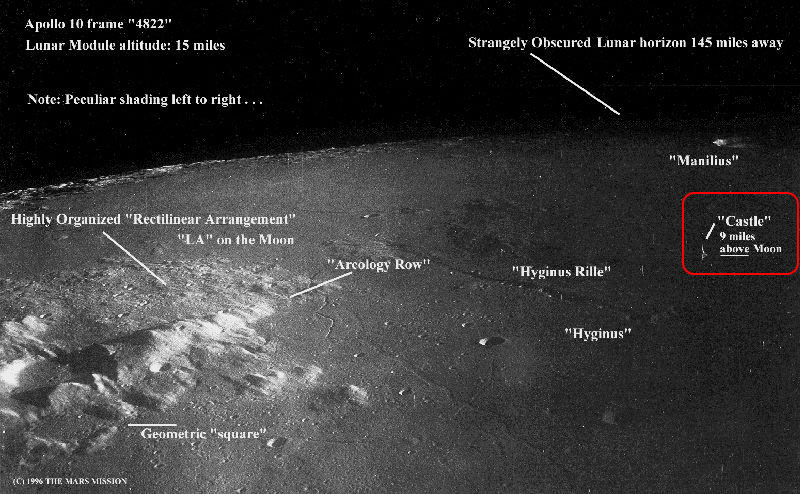 There is a rectangular area between factory and the crater Copernicus, which is 300 meters wide 400 meters long. Apollo-10 astronauts took a photo (AS10-32-4822 below) of a one-mile long object called “Castle,” which is at the height of 14 kilometers and casts a distinct shadow on the lunar surface.